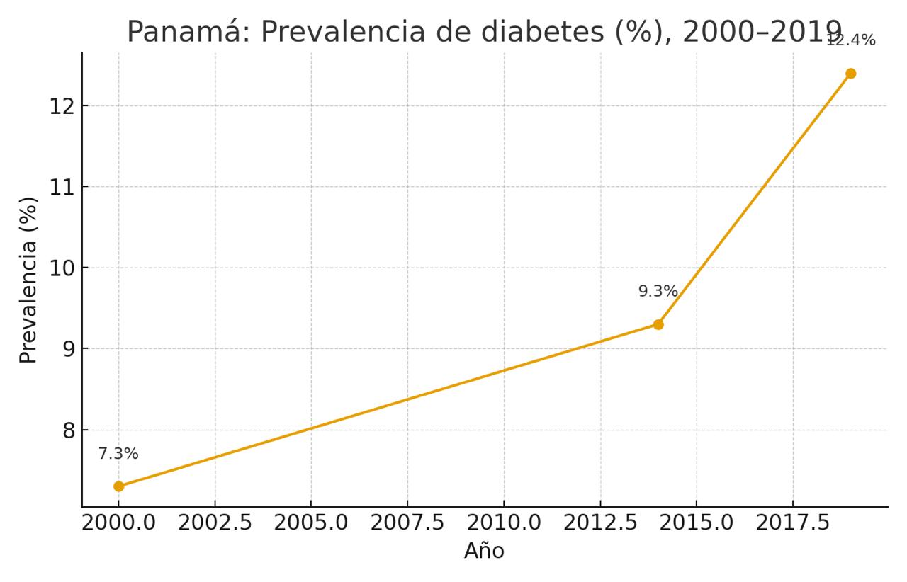 En Panamá, la prevalencia de diabetes ha pasado del 7.3% en el año 2000 al 12.4% en 2019, y continúa aumentando. Esto implica un incremento significativo en amputaciones, ceguera y enfermedades renales crónicas que demandan diálisis a edades cada vez más tempranas.